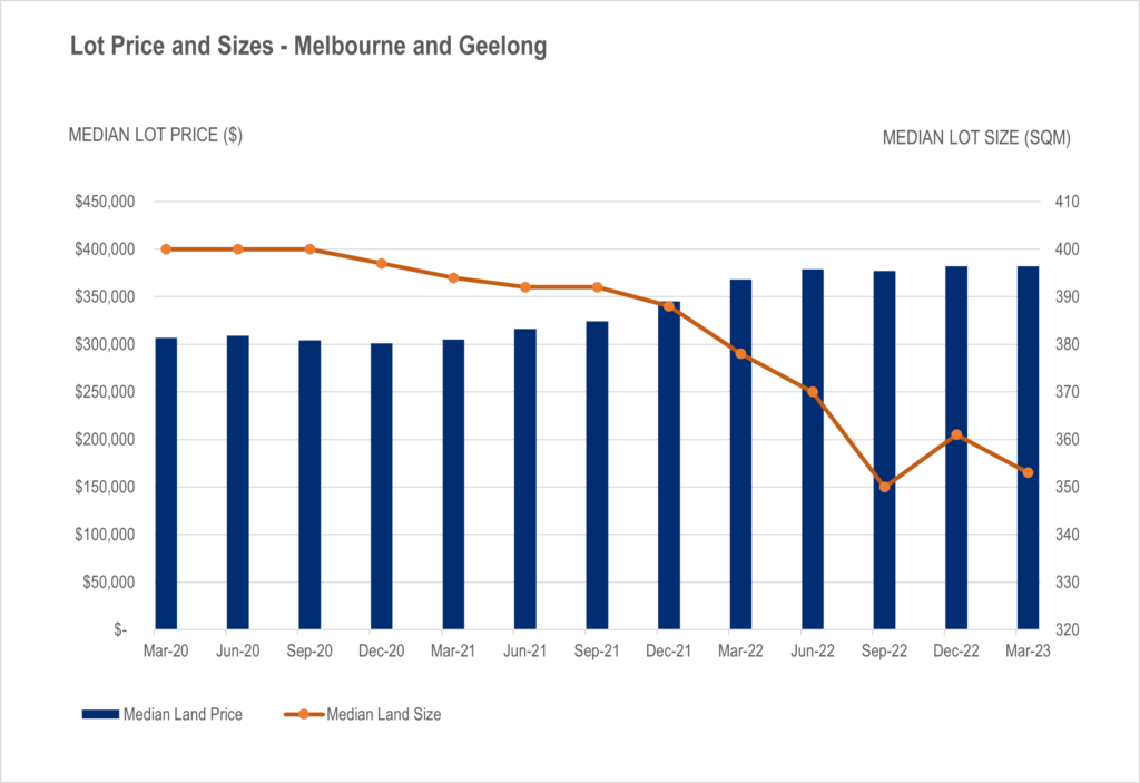 Melbourne’s median lot price dropped by 0.3% over Q1 to $380,900, while the median lot size shrunk by 2.1 % to 350 sqm, leading to the per sqm rates escalated by 2% to $1,088. In Geelong, as the median lot size increased by 3.8% to 400 sqm, the median lot price increased slightly by 2% to $385,000 and the average price per sqm dropped by 2% to $963.